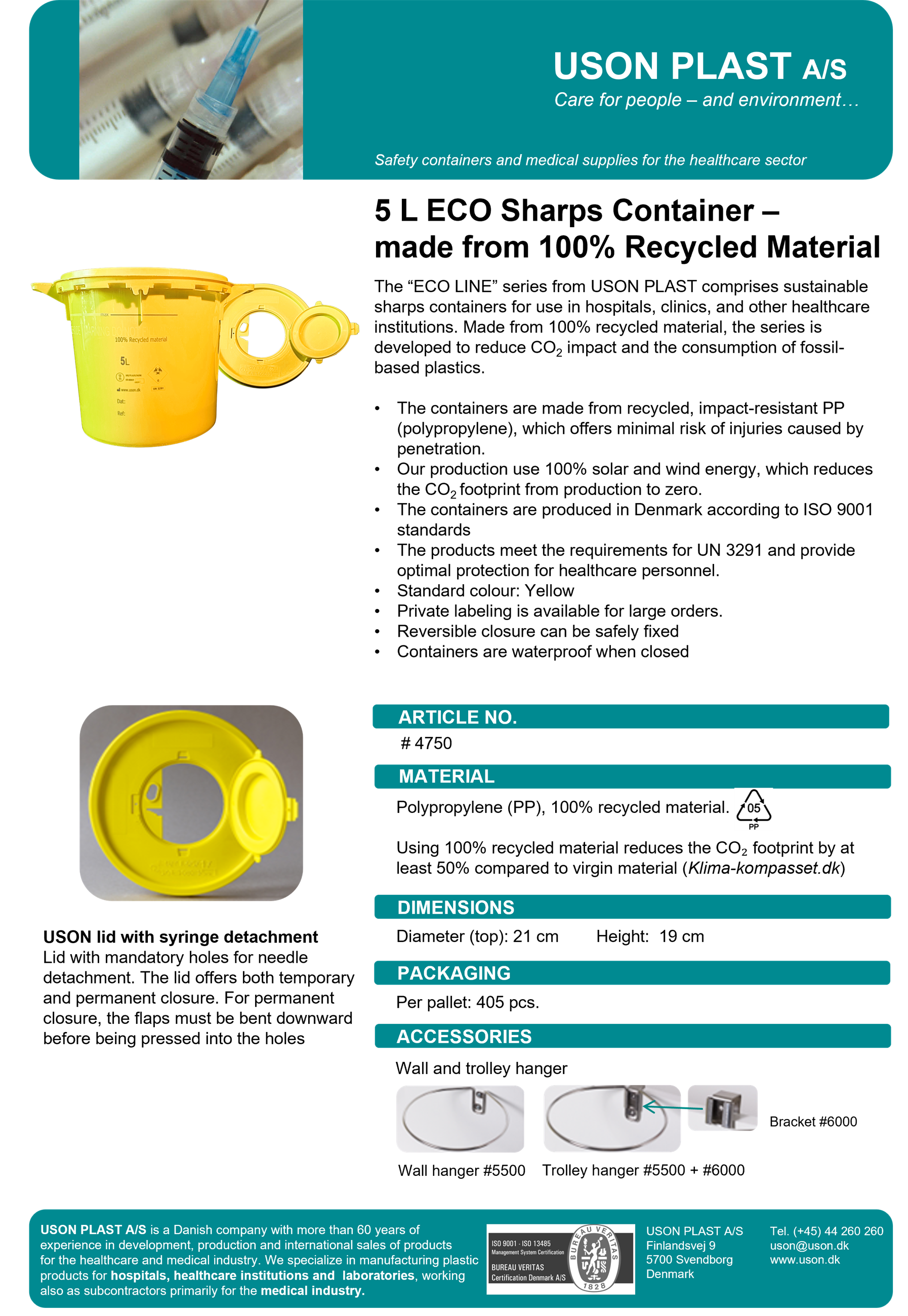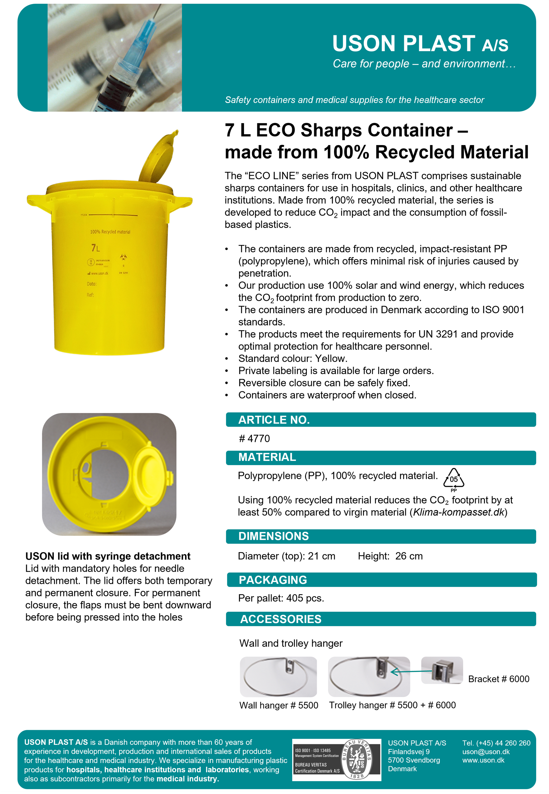 Lid with mandatory holes for needle detachment. The lid offers both temporary and permanent closure. For permanent closure, the flaps must be bent downward before being pressed into the holes.